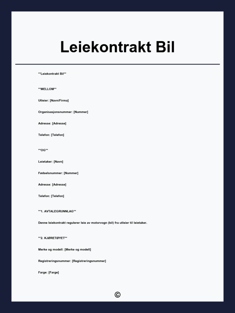 Last ned gratis kontrakt for privat bilutleie med klare avtaler om varighet, kjørelengde og overtakelsestidspunkt for trygg og enkel leie mellom privatpersoner.
